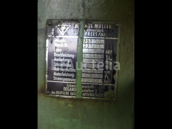 Excentrieke pers Merk: Muller Model: jaren 80 Jaar: 1958 Spanning: 400V driefasig Lengte: 120 cm Breedte: 130 cm Hoogte: 235 cm Staat: Niet getest