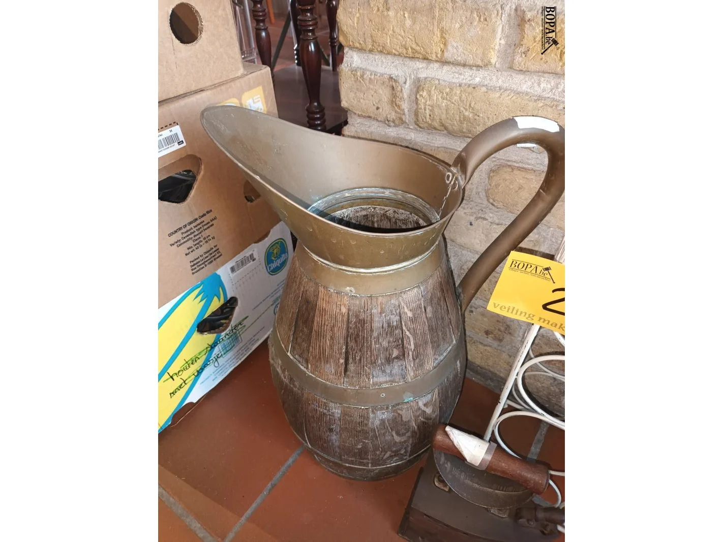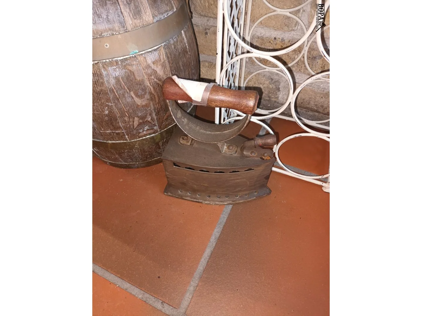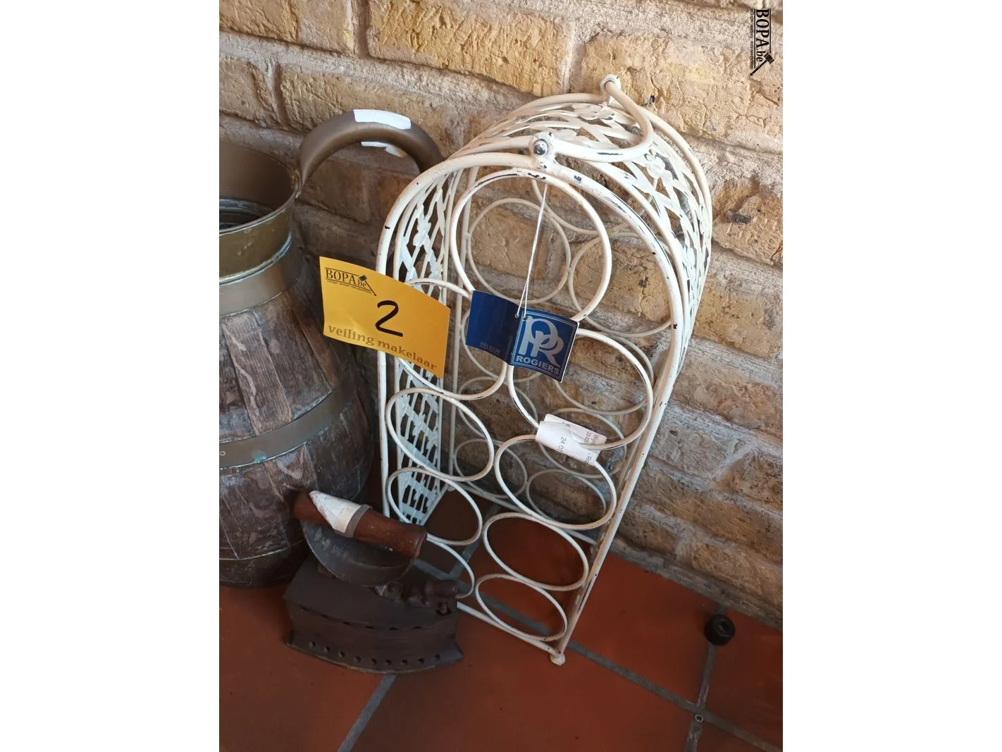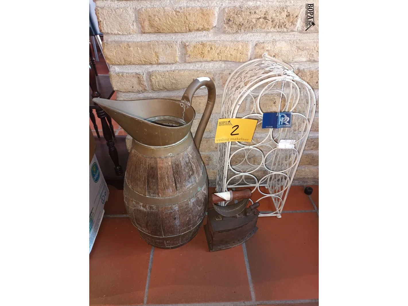 Lot 2 - houten kan, wijnrek en antiek strijkijzer