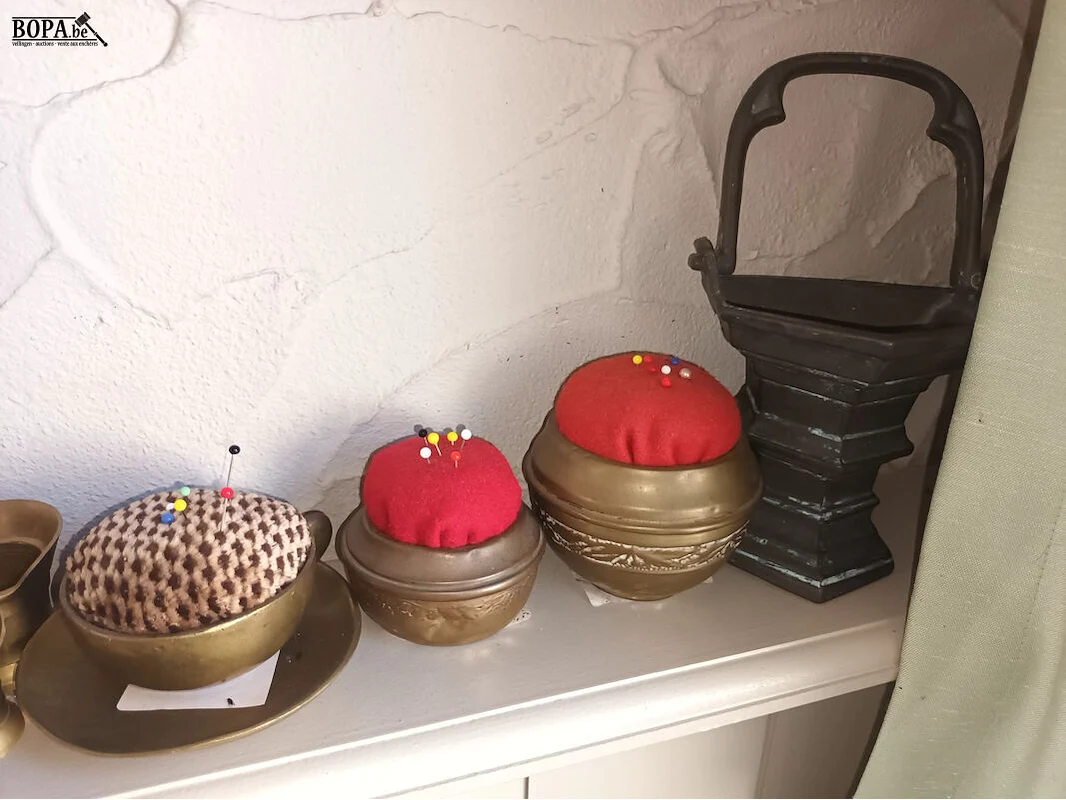 Koperen decoratie. 14 stuks. Speldenkussentjes en kannetjes.