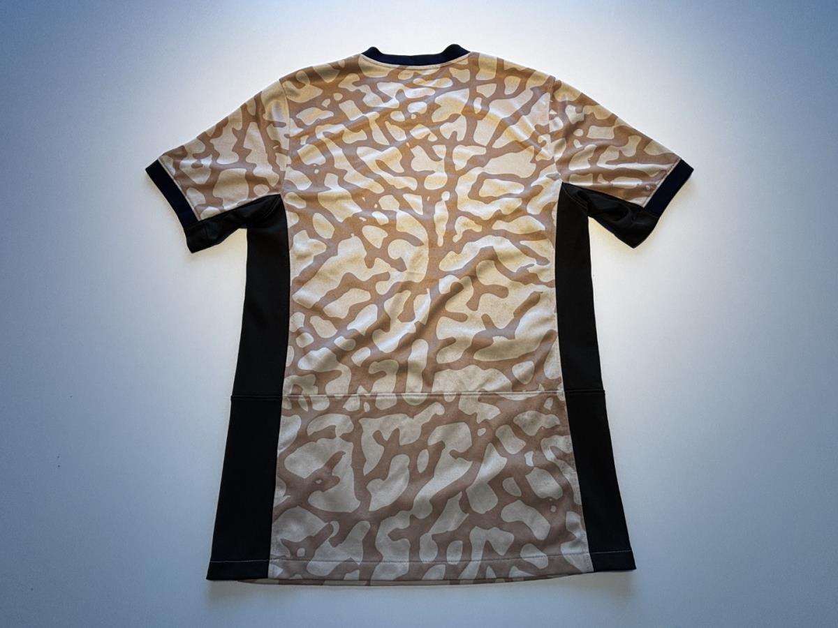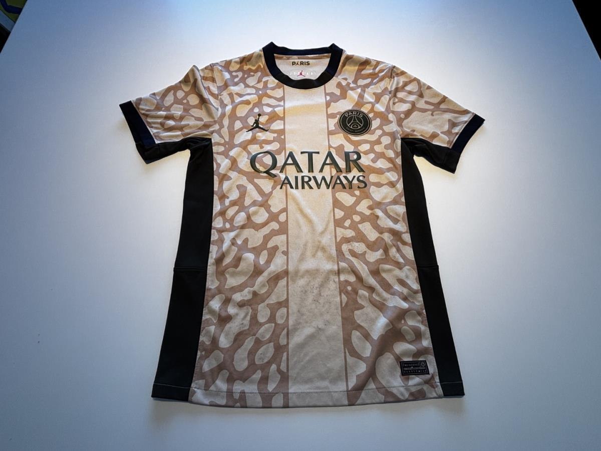 Dit is het Nike Paris Saint-Germain 2023/24 Stadium Fourth voetbalshirt, met de iconische Jordan 'Elephant Print' en sponsors Qatar Airways en Jordan Brand.