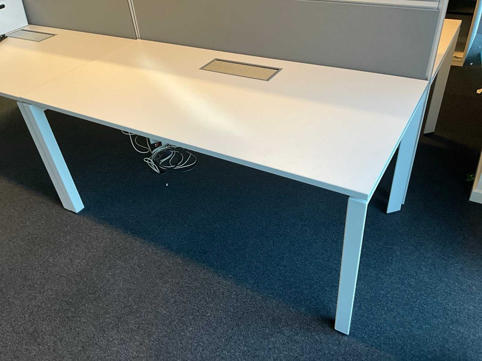 Voorzien van kabeldoorvoer. Compleet met 1 scheidingswand. Nee Merk: Steelcase Lengte: 80cm Breedte: 160cm Hoogte: 72cm Materiaal: Hout, metaal