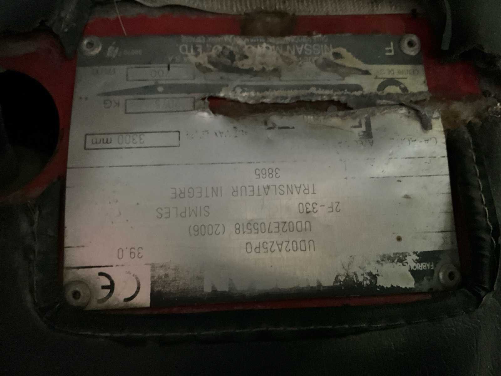 Voorzien van navulbare lpg tank, automaat aandrijving, semi gesloten cabine+ 2x losse deur, werking niet gekend Nee Merk: Nissan Type: UD02A25PO Bouwjaar: 2006 Serienummer: UD02E705518 Brandstof: LPG Soort band: Volrubber banden Aantal wielen: 4 Afgelezen urenstand: 5654 Free-lift: true Side-shift: true Duplex mast: true Eigen gewicht: 3900kg Hefvermogen: 2500kg Lepellengte: 1150mm Hefhoogte: 3300mm Vol rubber banden: true Minimale doorrijhoogte: 2200mm Totale afmeting L: 2700mm Totale afmeting Breedte: 1200mm Totale afmeting Hoogte: 2200mm LPG: true