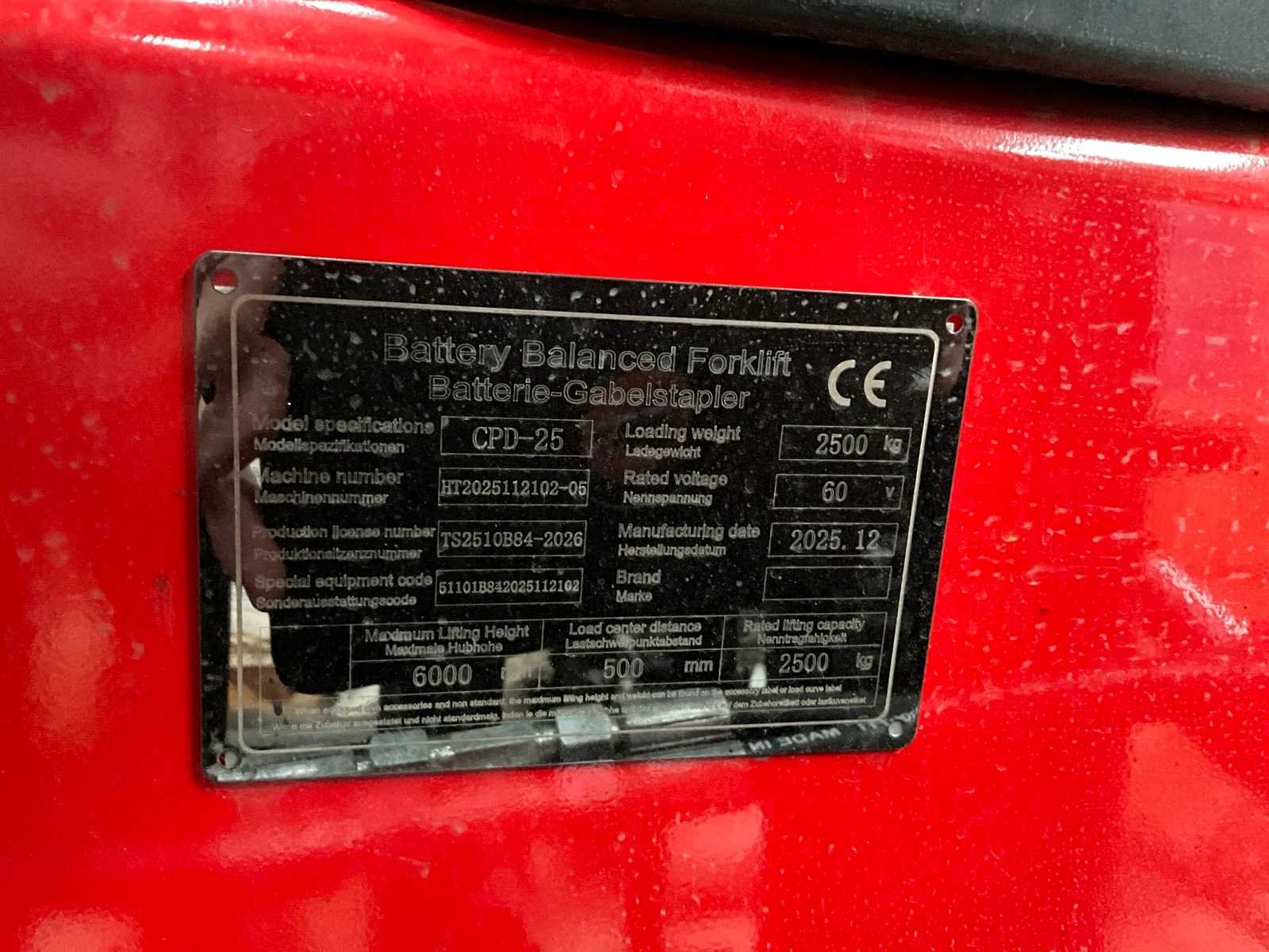 Incl. Oplader Nee Merk: HUATENG Type: CPD-25 Bouwjaar: 2025 Serienummer: HT2025112102-05 Afgelezen urenstand: 4.9 Side-shift: true Triple mast: true Hefvermogen: 2500kg Lepellengte: 1200mm Max. hefhoogte: 6000mm Vol rubber banden: true Minimale doorrijhoogte: 2610mm Totale afmeting L: 2400mm Totale afmeting Breedte: 1200mm