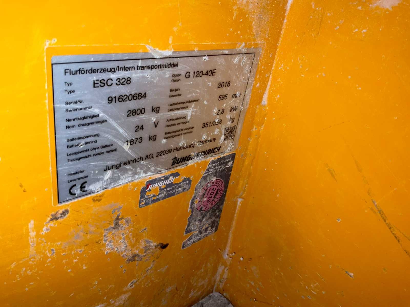 - Hefhoogte: circa 595mm. - Totale afmeting Breedte: 1030mm. - sleutel: aanwezig. - accu leeg. Nee Merk: Jungheinrich Type: ESC328 Bouwjaar: 2018 Serienummer: 91620684 Accu lader: true Hefvermogen: 2800kg Lepellengte: 1190mm Totale afmeting Hoogte: 2550mm Elektrisch: true