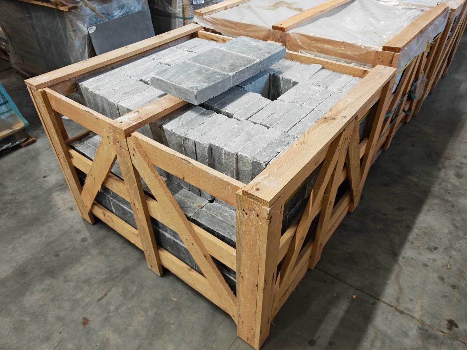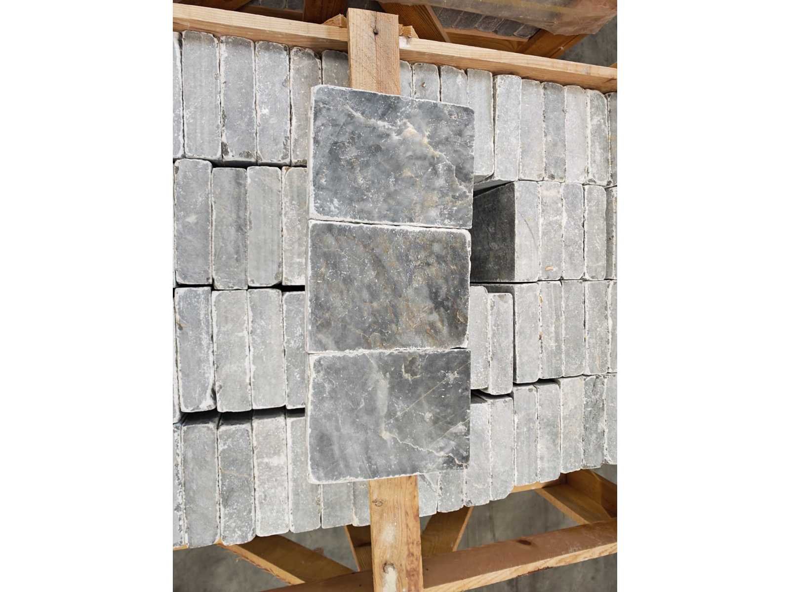 3 kratten No Merk: Natuursteen Kleur: Blauw Afwerking: Gezoet en Getrommeld Lengte: 180mm Breedte: 240mm Dikte: 50mm Materiaal: Hardsteen Type: Vloertegel Aantal m² per verpakking: 9.33m² Aantal pakken: 3 Totaal oppervlakte: 27.99m² Totaal gewicht: 2800kg