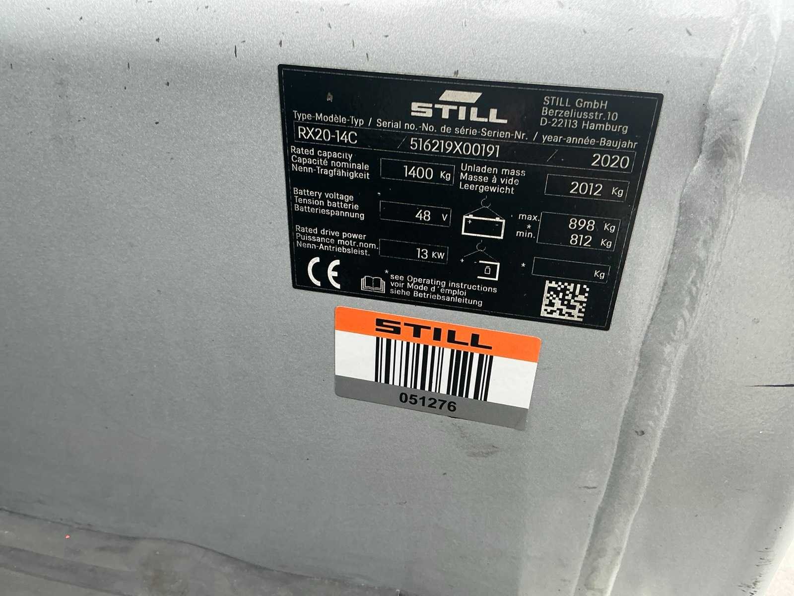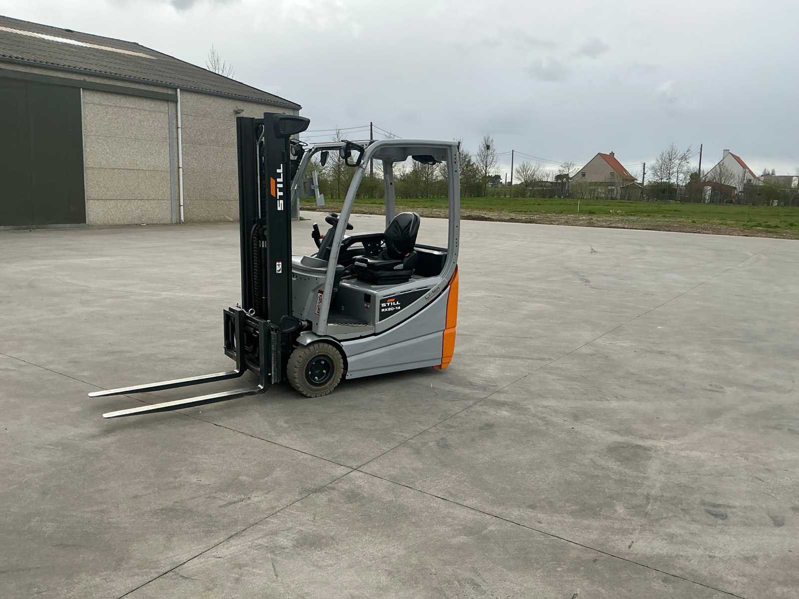 Led werklichten voor en achter , blue spot , flash light ,verlichte documenten houder , no marking banden Nee Merk: Still Type: RX20-14C Bouwjaar: 2020 Serienummer: 516219X00191 Brandstof: Elektrisch Mast: Single Soort band: Volrubber banden Aantal wielen: 4 Afgelezen urenstand: 6350 Free-lift: true Side-shift: true Eigen gewicht: 2910kg Hefvermogen: 1400kg Lepellengte: 1150mm Min. hefhoogte: 0mm Max. hefhoogte: 3400mm Vol rubber banden: true Totale afmeting L: 1950mm Totale afmeting Breedte: 1120mm Totale afmeting Hoogte: 2150mm Leveringsvoorwaarden: Gratis op vrachtwagen