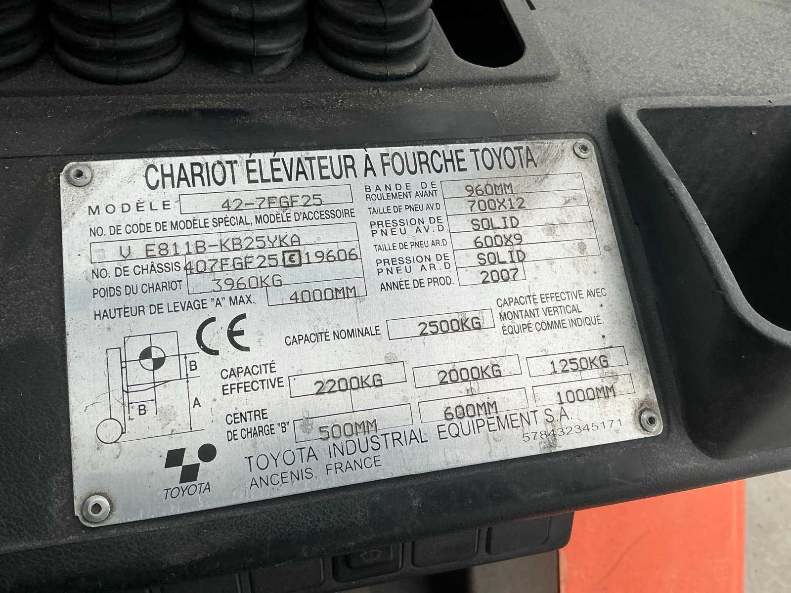 Bolzoni Auramo side shift vorkversteller, werklichten voor , flash light , gold edition Nee Merk: Toyota Type: 42-7FGF25 Bouwjaar: 2007 Serienummer: 407FGF25 19606 Brandstof: LPG Mast: Duplex Soort band: Volrubber banden Aantal wielen: 4 Afgelezen urenstand: 6700 Side-shift: true Hydraulisch verstelbare lepels: true Duplex mast: true Eigen gewicht: 3960kg Hefvermogen: 2500kg Lepellengte: 1200mm Min. hefhoogte: 0mm Max. hefhoogte: 4000mm Vol rubber banden: true Totale afmeting L: 2600mm Totale afmeting Breedte: 1150mm Totale afmeting Hoogte: 2500mm Leveringsvoorwaarden: Gratis op vrachtwagen