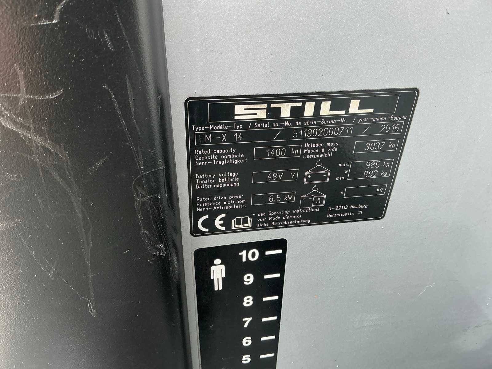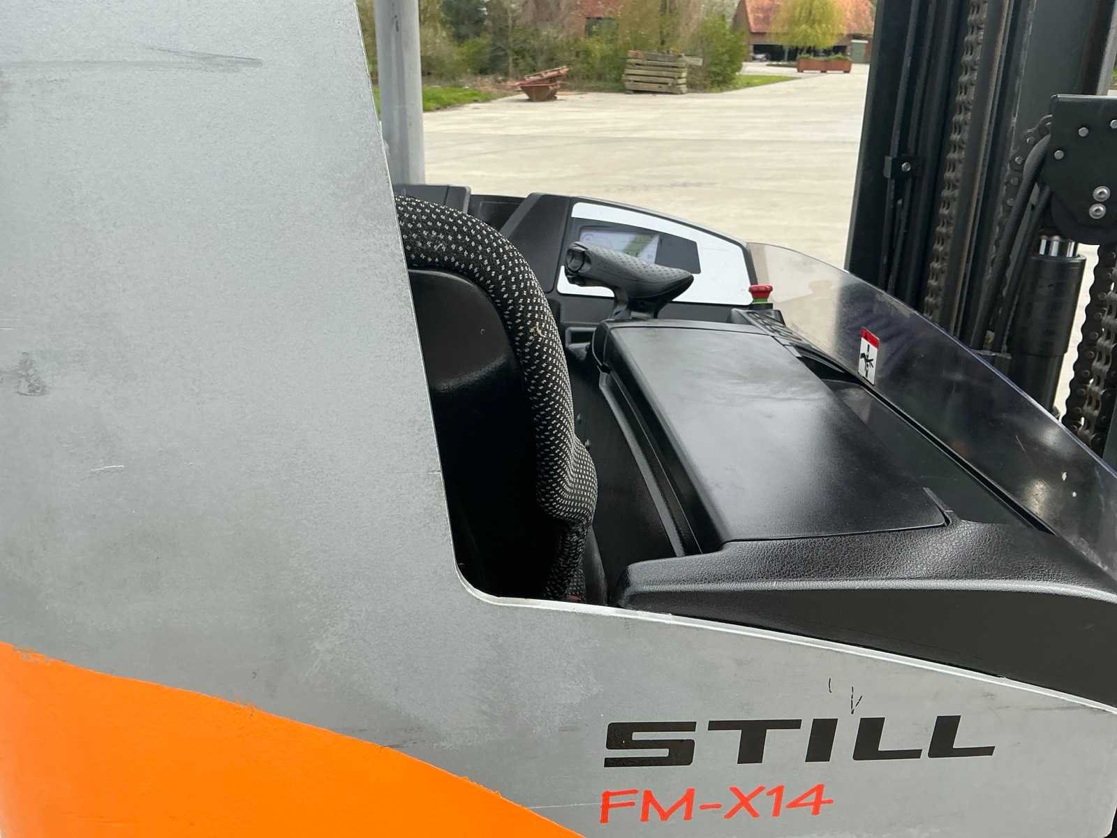 Led werklichten voor en achter , blue spot , flash light , accu met automatische vulling Nee Merk: Still Type: FM-X14 Bouwjaar: 2016 Serienummer: 511902G00711 Mast: Triplex Afgelezen urenstand: 6800 Triple mast: true Hefvermogen: 1400kg Lepellengte: 1150mm Min. hefhoogte: 0mm Max. hefhoogte: 6000mm Totale afmeting L: 1800mm Totale afmeting Breedte: 1300mm Totale afmeting Hoogte: 2600mm Elektrisch: true Leveringsvoorwaarden: Gratis op vrachtwagen