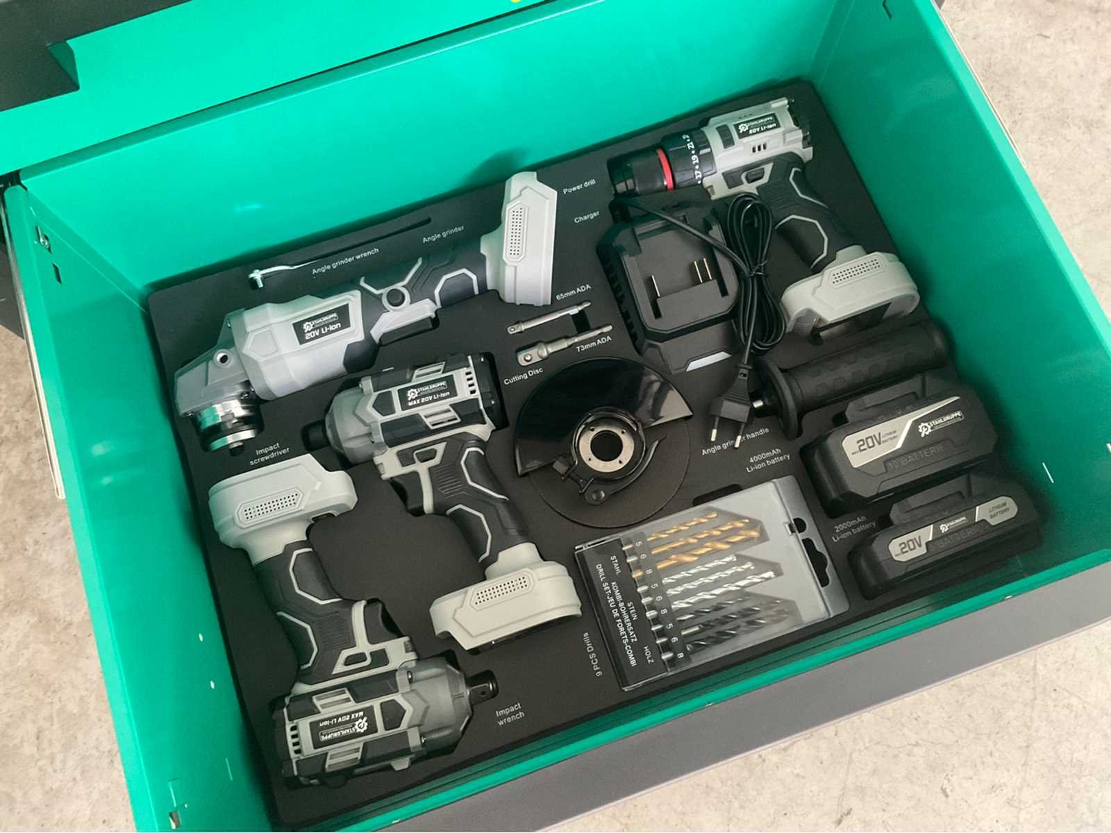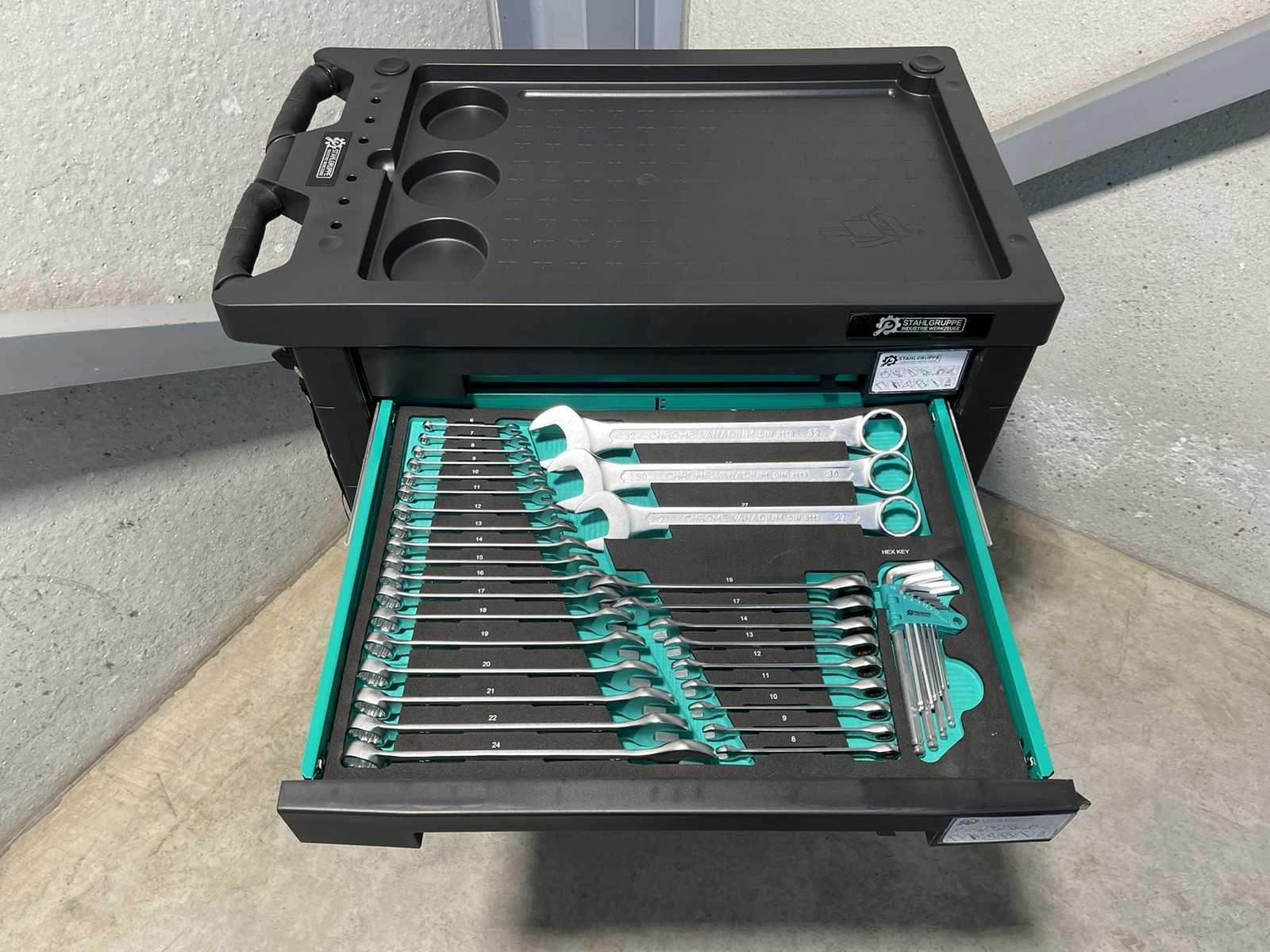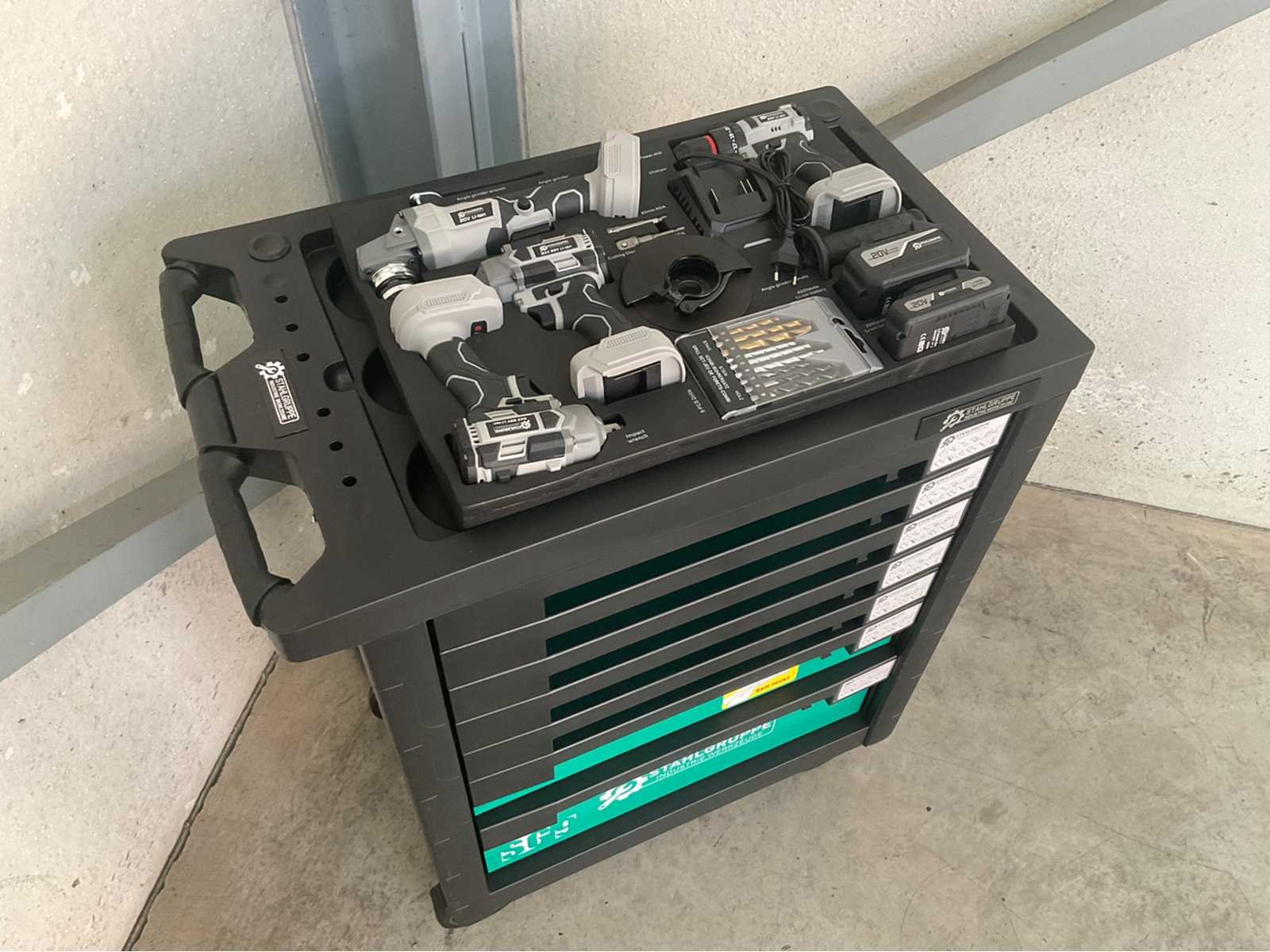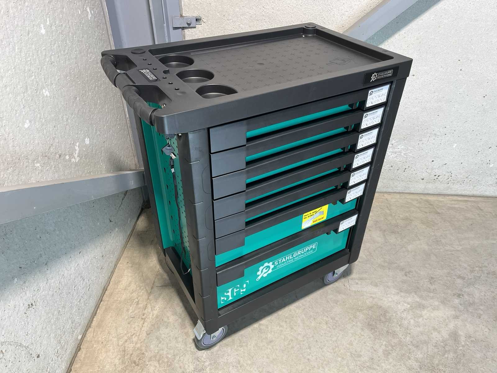 <li><b>gevulde gereedschapswagen met bijhorende set accu gereedschappen</b></li> <li><strong>Merk:</strong> Stahlgruppe</li> <li><strong>Type:</strong> SG9</li> <li><strong>Aantal laden:</strong> 7 laden</li> <li><strong>Aantal gevulde laden:</strong> 5 gevulde laden (+1)</li> <li><strong>Kast:</strong> dubbelwandige kast met automatisch vergrendelende laden</li> <li><strong>Gereedschap:</strong> Chrome Vanadium gereedschap</li> <li><strong>Inhoud:</strong> <ul> <li>2 dopsleutel sets (1/4” & 1/2”)</li> <li>ring- steeksleutelset (6-32 mm)</li> <li>ringratel-steeksleutelset (8-19 mm)</li> <li>Inbussleutels (1,5-10 mm)</li> <li>schroevendraaiers (21 stuks)</li> <li>Torxsleutels (T8-T70)</li> <li>beitels en pendrijvers (9 stuks)</li> <li>diverse hamers (2 stuks)</li> <li>diverse tangen (9 stuks)</li> <li>schuifmaat (0-150 mm * 0,05 mm)</li> <li>enzovoort…</li> </ul> </li> <li><strong>Staat:</strong> ongebruikt, in de originele verpakking</li> Nee Merk: Stahlgruppe Type: SG9