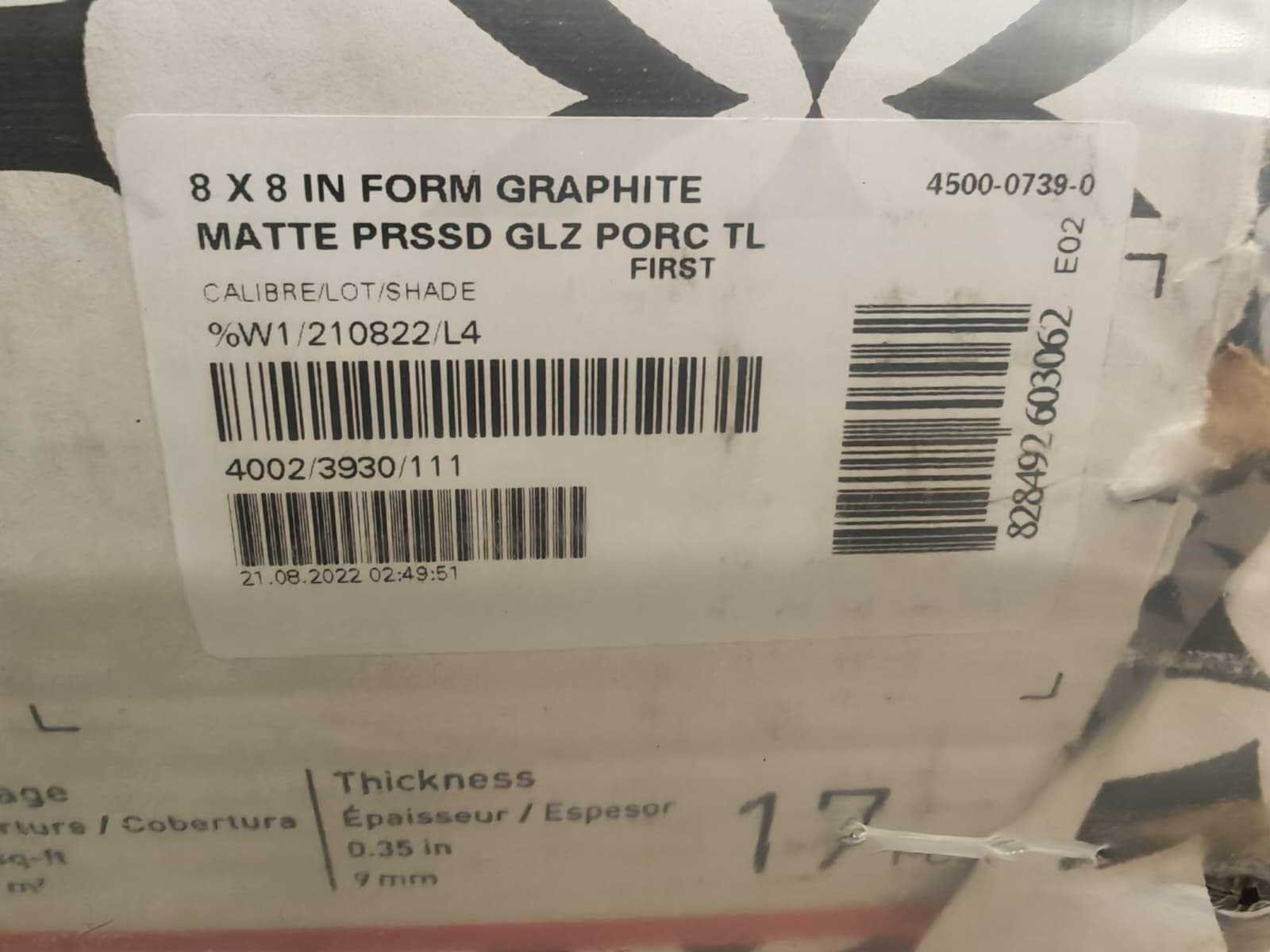 No Merk: Anatolia Kleur: Graphite Afwerking: Mat Lengte: 200mm Breedte: 200mm Dikte: 9mm Materiaal: Keramiek Type: Vloertegel Model: Form Aantal m² per verpakking: 1m² Aantal pakken: 18 Totaal oppervlakte: 18.36m² Totaal gewicht: 370kg