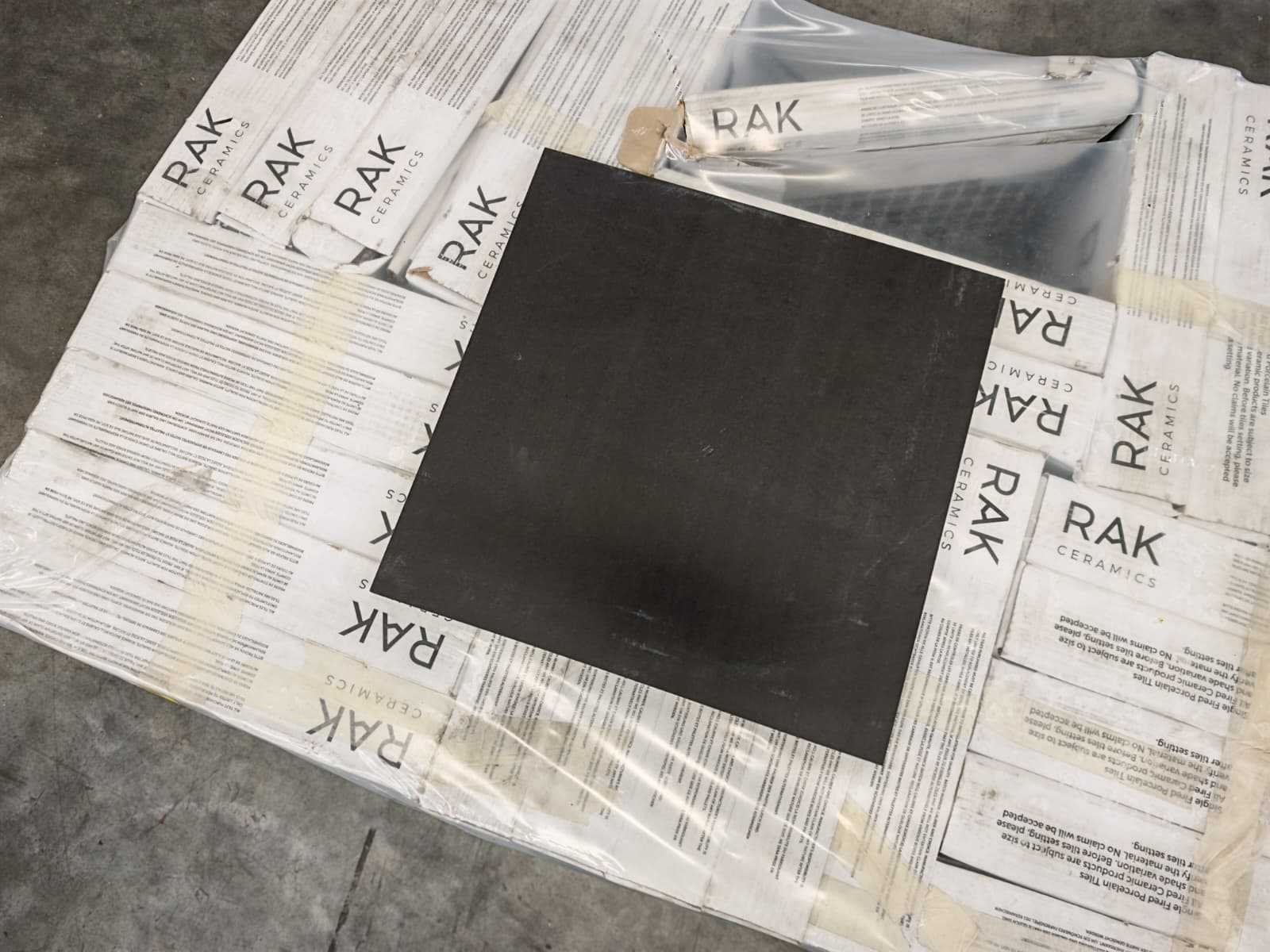 No Merk: RAK Kleur: Zwart Afwerking: Mat Lengte: 400mm Breedte: 400mm Dikte: 10mm Materiaal: Keramiek Type: Vloertegel Model: GPD57UP Aantal m² per verpakking: 1.12m² Aantal pakken: 60 Totaal oppervlakte: 67.2m² Totaal gewicht: 1350kg
