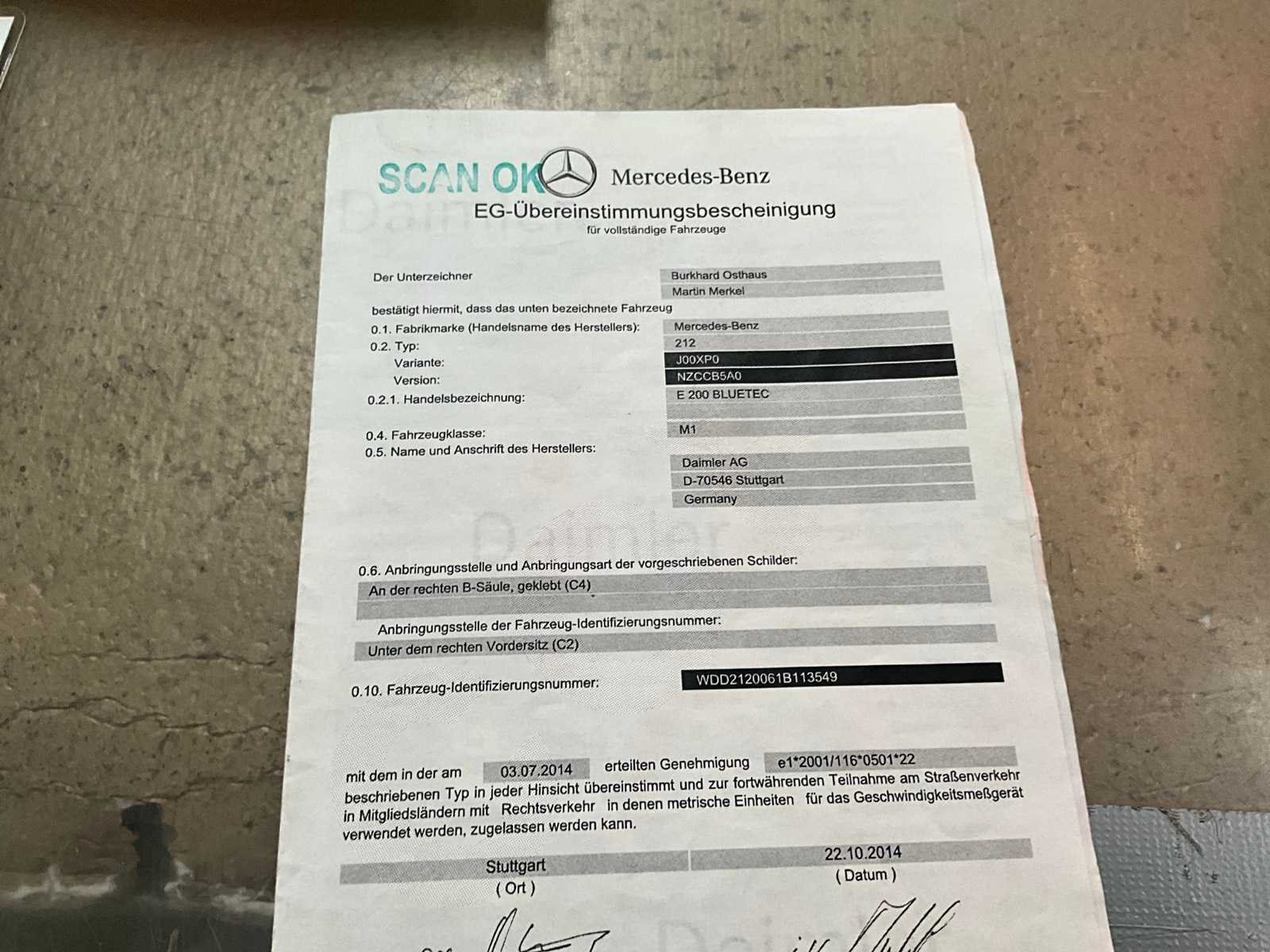 Aanwezige boorddocumenten:inschrijvingsbewijs deel I en II, keuringsbewijs, gelijkvormigheidsattest No Merk: Mercedes-Benz Model: E200 Bouwjaar: 2014 Cilinderinhoud: 2143cc Vermogen (kW): 100kW Brandstof: diesel Chassisnummer: WDD21261B113549 Datum eerste toelating: 08/11/14 Kleur: Zwart Transmissie: Automaat Emissieklasse: Euro6 Aantal sleutels: 3 Nationaliteit documenten: Belgisch Start en rijdt: Nee Keuringsrapport geldig tot: 06/02/22 Zichtbare schade: Schade rondom wagen: zie foto’s Vavato voert geen technische keuring uit.: true Inschrijvingsbewijs - deel 1 : Aanwezig Inschrijvingsbewijs - deel 2: Aanwezig
