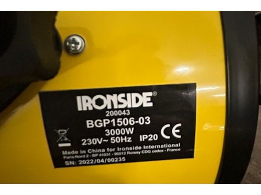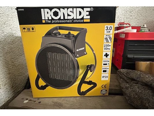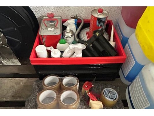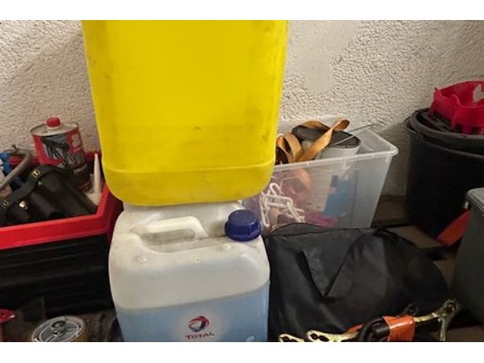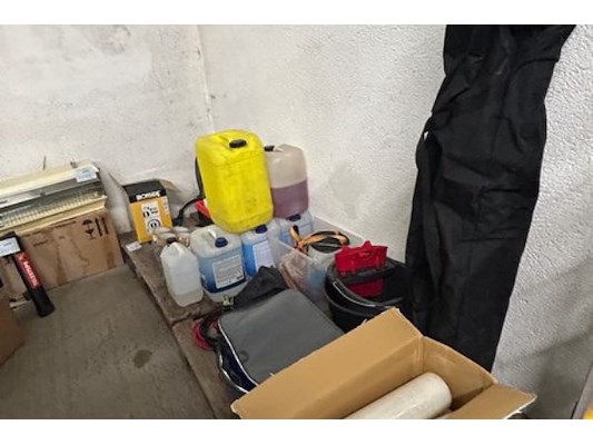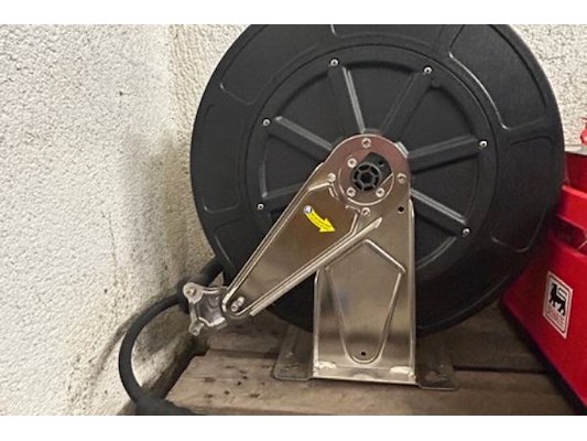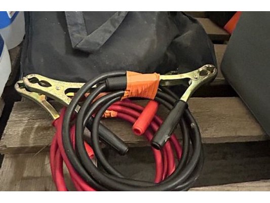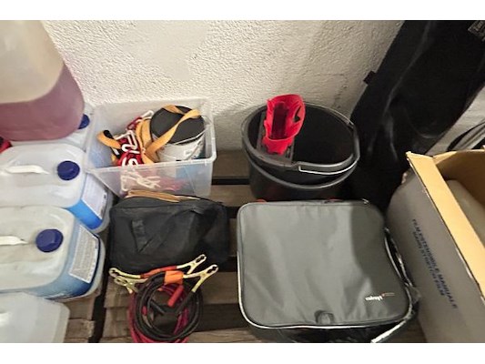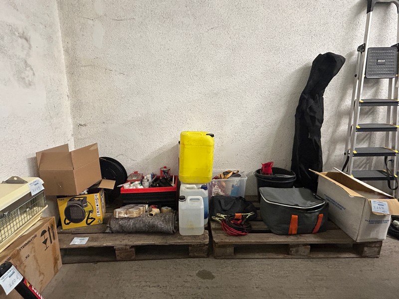 Divers materiaal waaronder startkabels, folie, plakband, heteluchtblazer Ironside 3 kW, waterslang op haspel ongeveer 25m